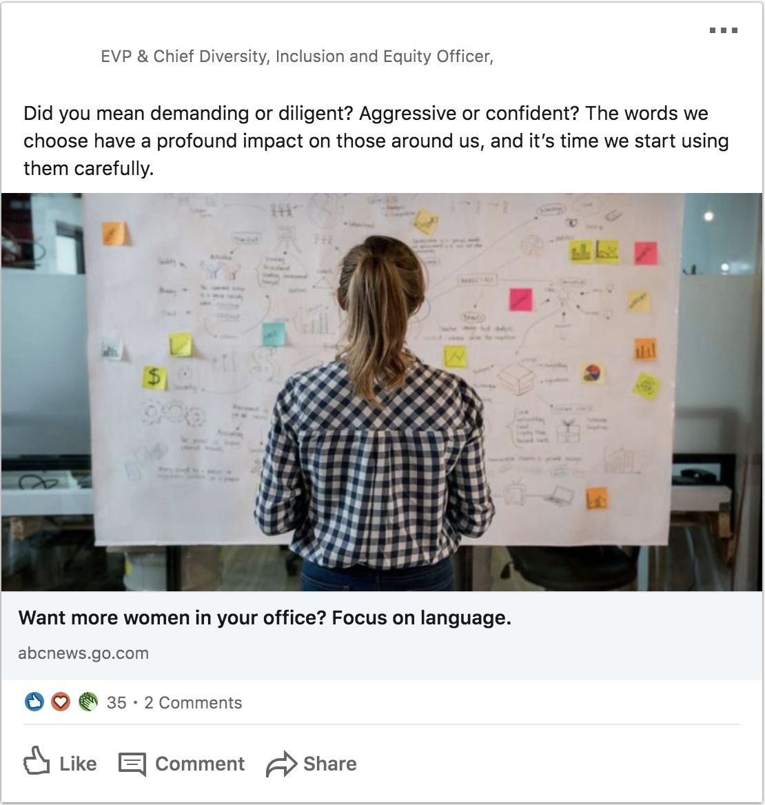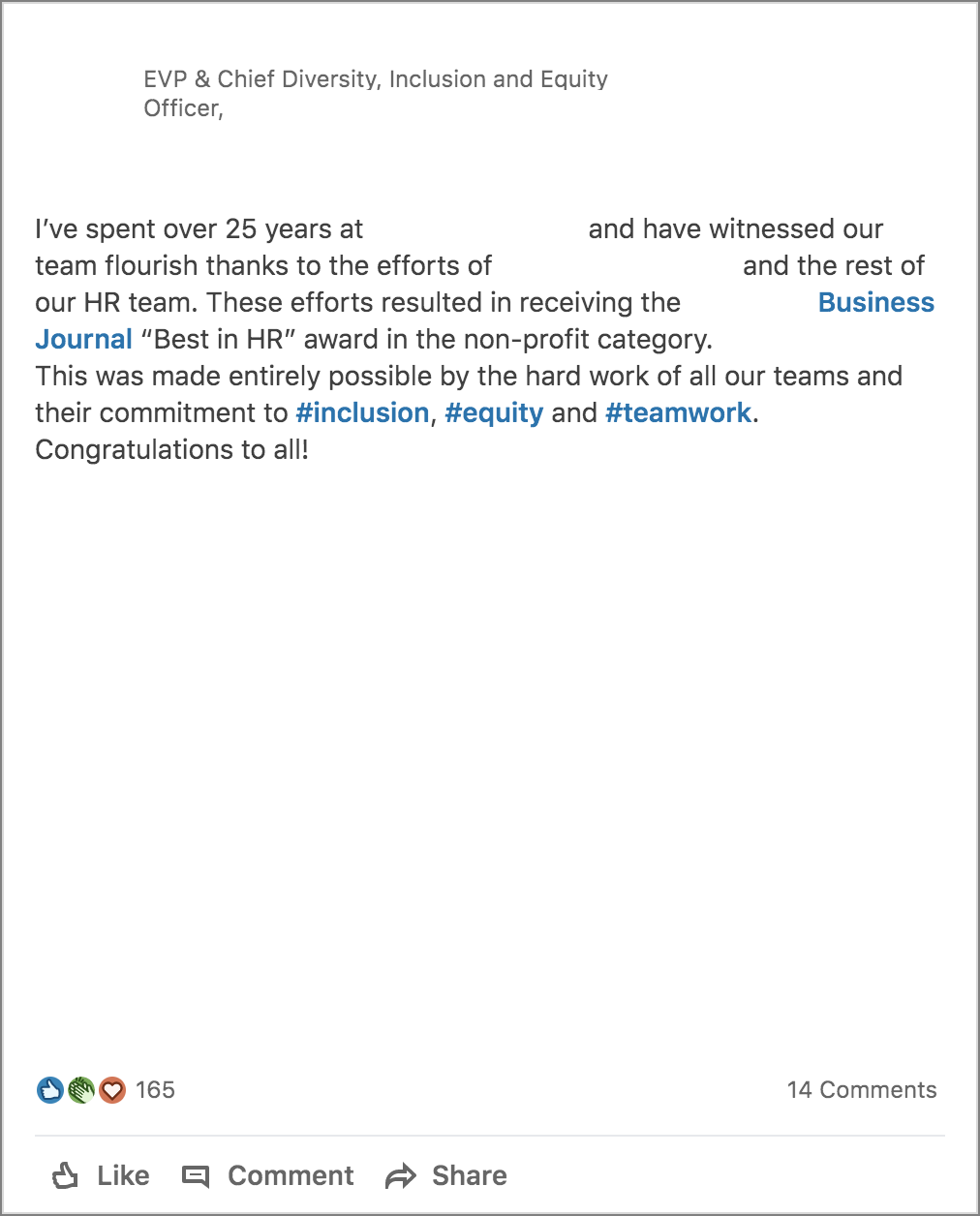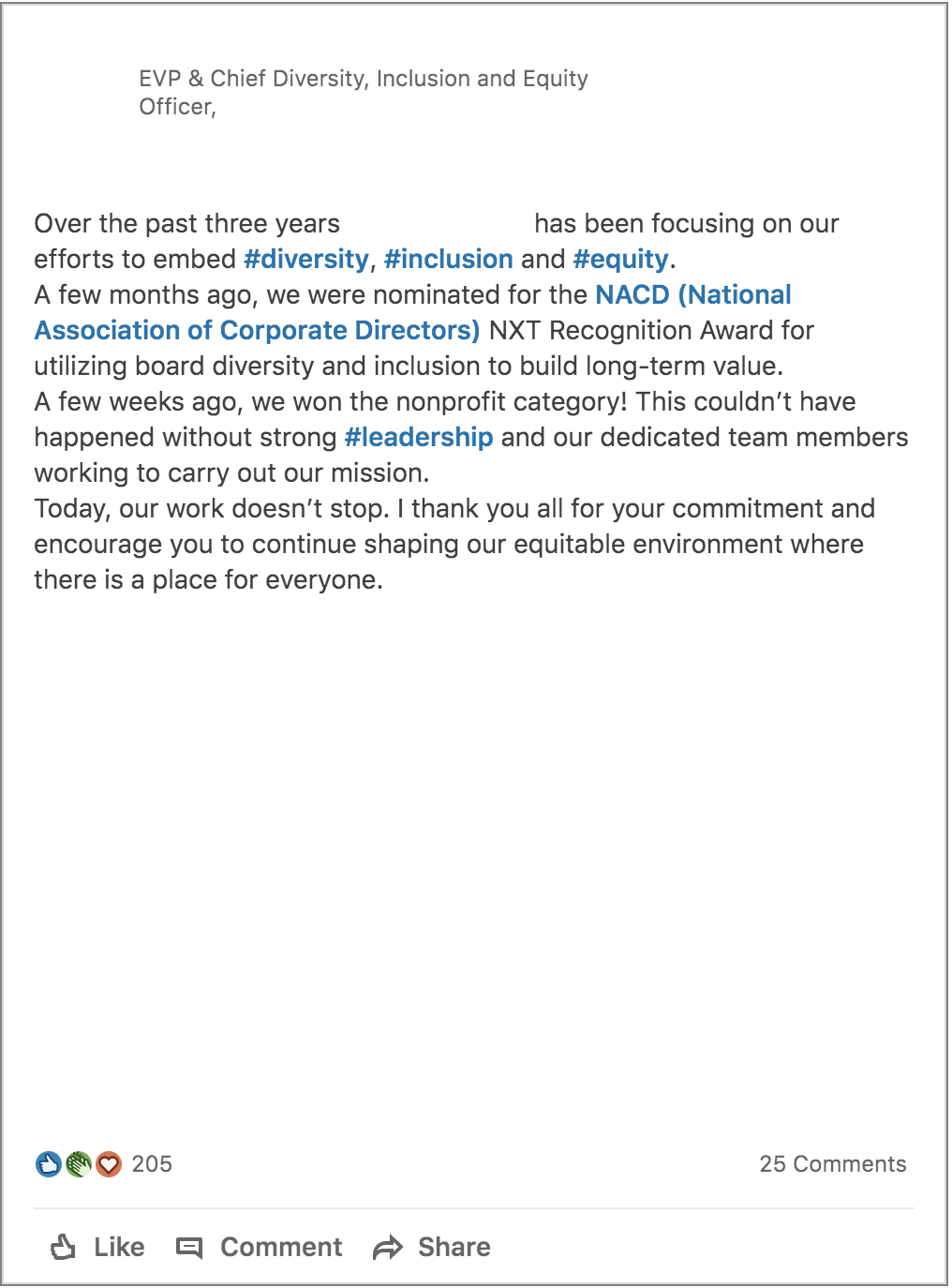 To enhance the brand of a health system client through its executives, I helped rebrand and manage the LinkedIn of the Executive Vice President and Chief Diversity, Inclusion and Equity Officer.